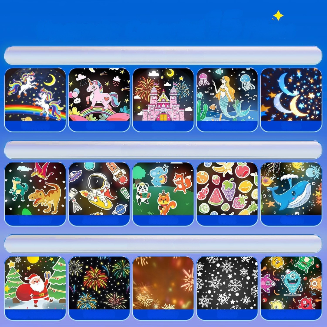 Creates a magical atmosphere: 15 themed films with stars, space, and dinosaurs spark imagination.