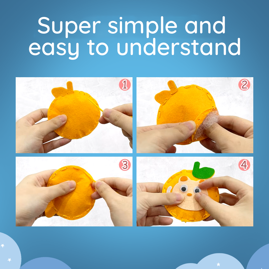 • Tools Included: Safe plastic needles, thread, pre-cut fabric shapes