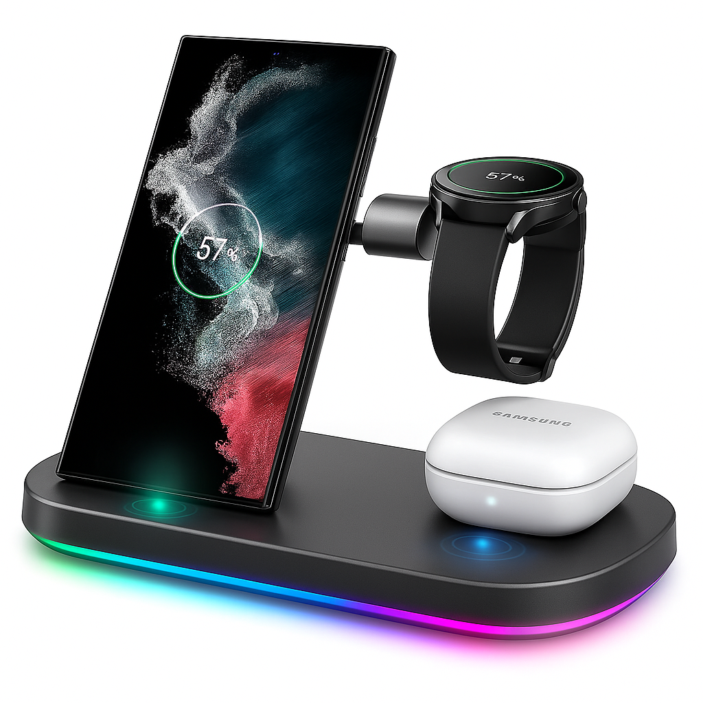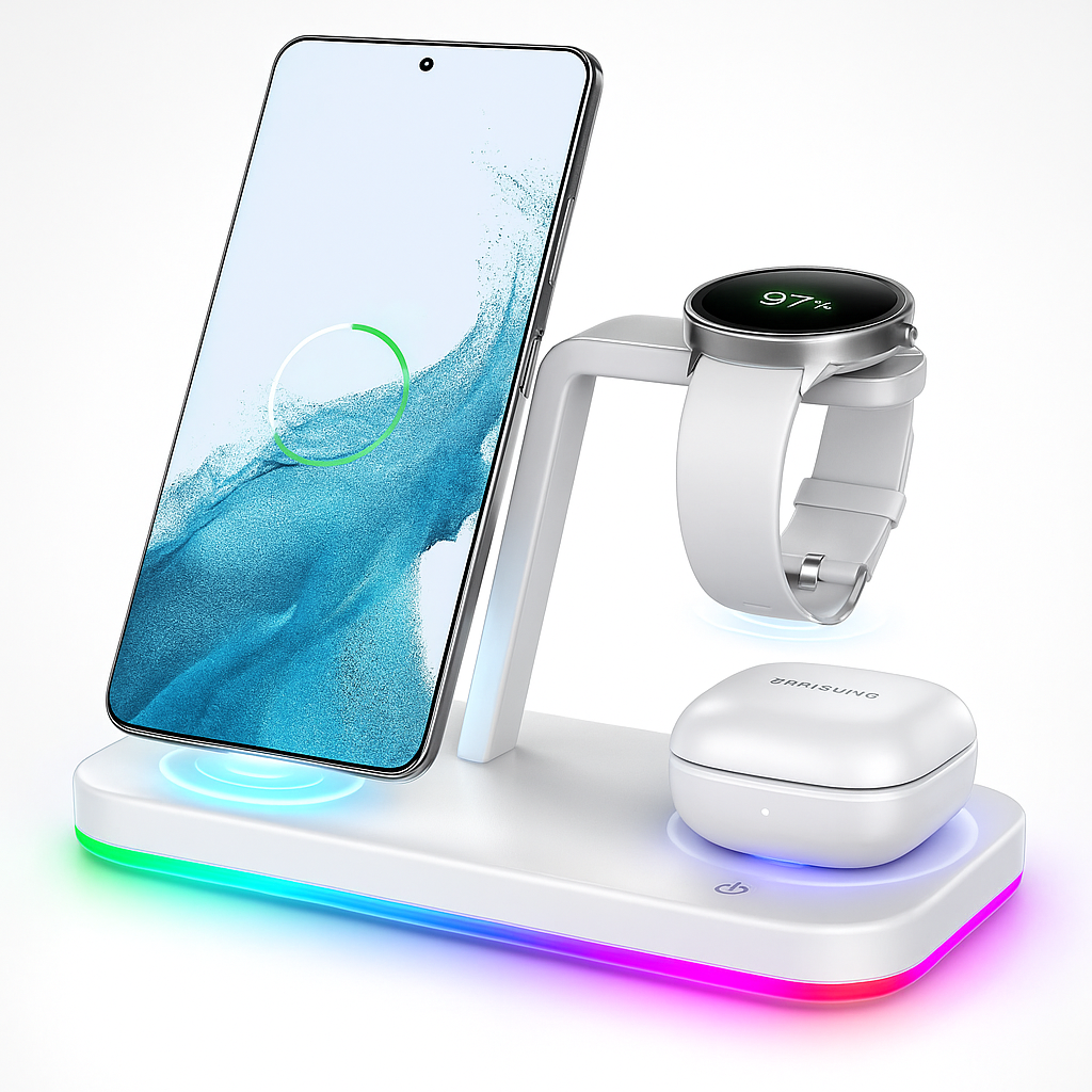 Upgrade your setup with this wireless charger that powers your phone, smartwatch, and earbuds all at once. Its sleek and compact design fits perfectly on your desk or bedside table, reducing cable clutter while delivering fast and reliable wireless charging. Ideal for home, office, or travel, this charger keeps your essential devices ready to go.